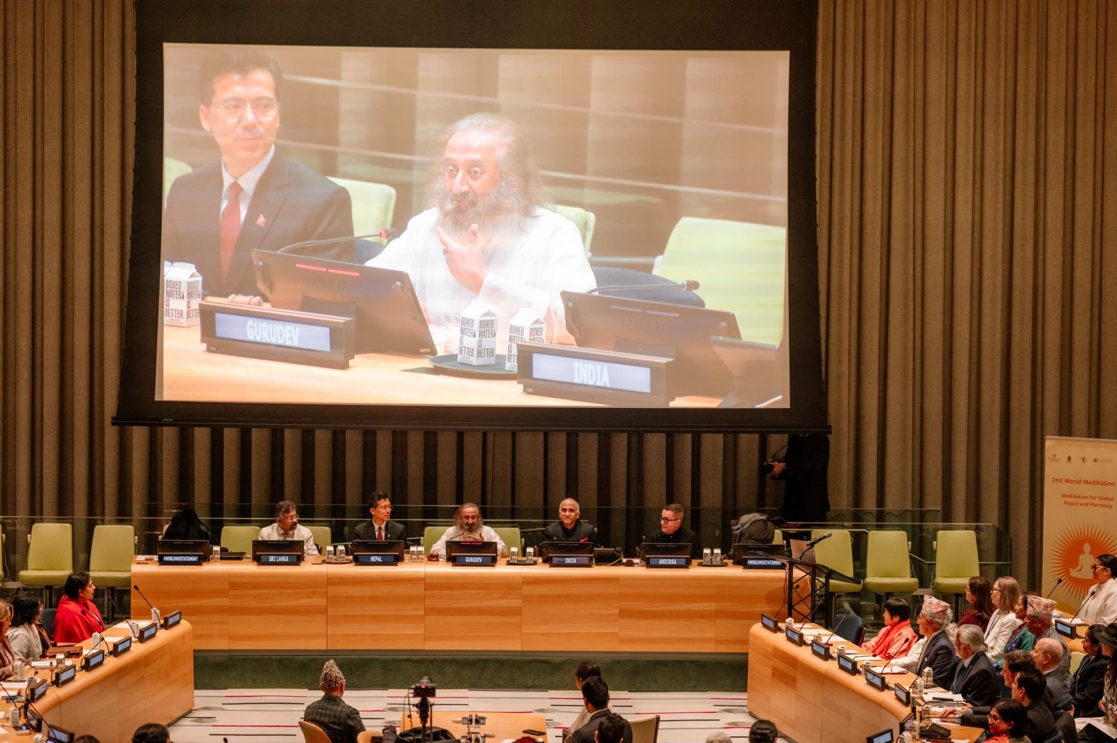 - Gurudev addresses UN officials on meditation as a peacebuilding tool.