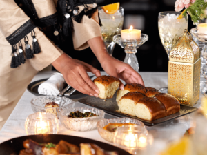 Offer: An artistic Iftar experience featuring live food stations, traditional ouzi, and a unique cake shawarma station.