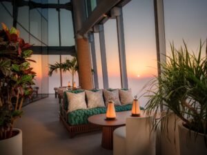 As the evening approaches, the lounge transforms into the Sunset Experience. For just AED 195, guests receive two cocktails and a Chef’s Platter, providing the ideal, aspirational way to watch the golden hour paint the 360-degree horizon. As night falls, the space evolves into a high-energy lounge with curated DJ sets and bespoke crafted cocktails, making it a captivating destination for evening entertainment. This dual offering ensures the lounge is relevant for everything from elegant networking to late-night social buzz, maximizing the spectacular setting.